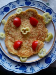 Csüt= 2szelet (100 gr)kenyér, 1db (50 gr) tojás, 2evőkanál olaj, (bundás kenyeret készítünk) 30 gr paradicsom
